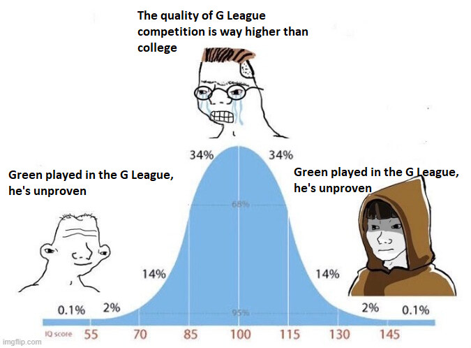 Yeah basically there were a ton of casual people who wrote off Green specifically because he played in the G League, and then a bunch of less casual fans got all pissy about how the G League is way better than college, and then the love went way too far with it. I feel like no one brings this up.