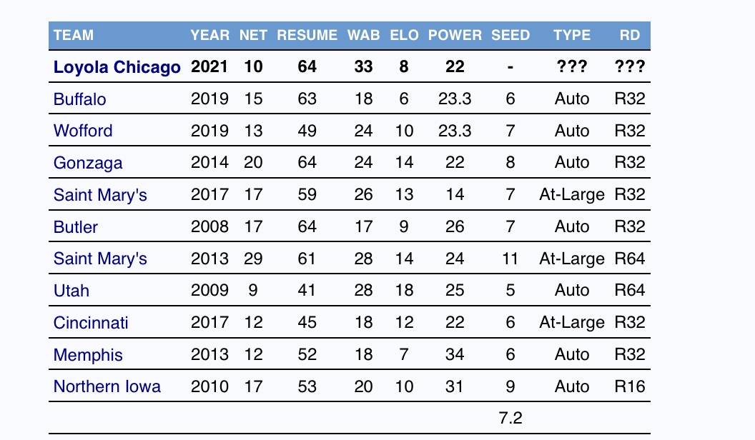 Average seed of 7.2 for the similar comps. I’ll go over it below, but I think the teams there that got higher seeds had solidly better resumes. Loyola had zero top 50 Torvik wins in the regular season and only 3 top 100 wins. Yes, you can only play who’s on your schedule. But I don’t see how you can seed them much higher than 7 or 8 with the resume that they have.
