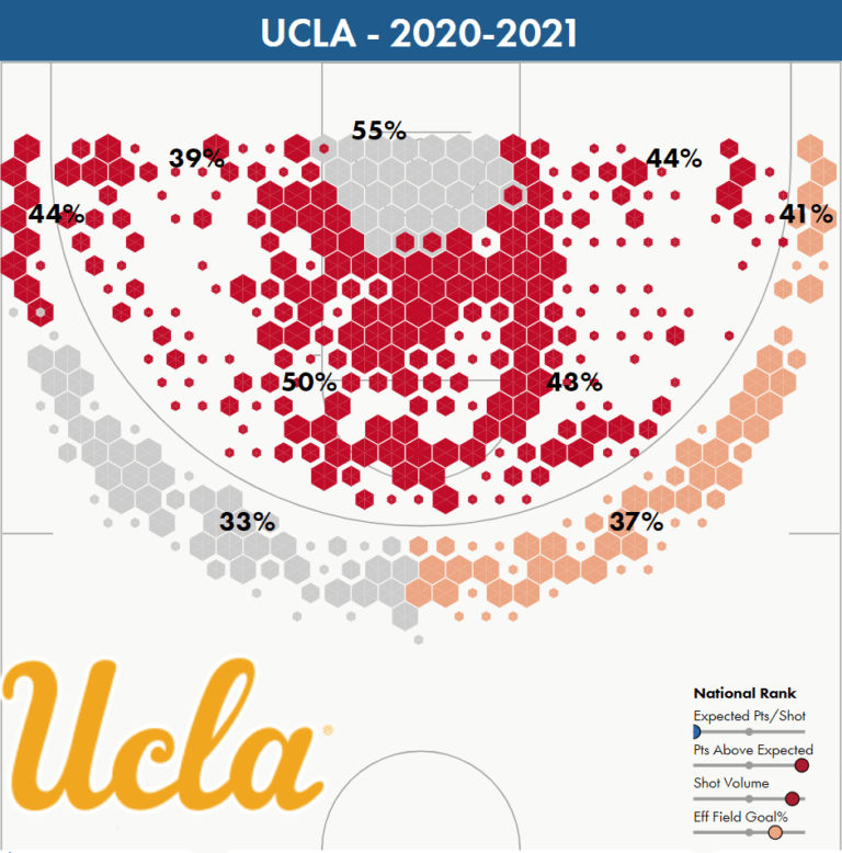 UCLA loves mid-range jumpers. The Bruins are ranked 3rd nationally in mid-range volume and 4th in mid-range accuracy.