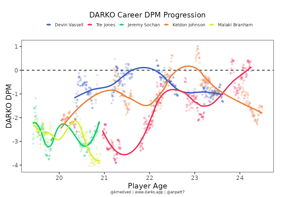 Surprising absolutely no one I spend an obscene amount of time just plugging dudes into that thing and one thing that really does jump out is just how variable aging curves are player to player. Some of it is that defense pops first and offense develops much more slowly. But a lot of it is just pure player to player variability.