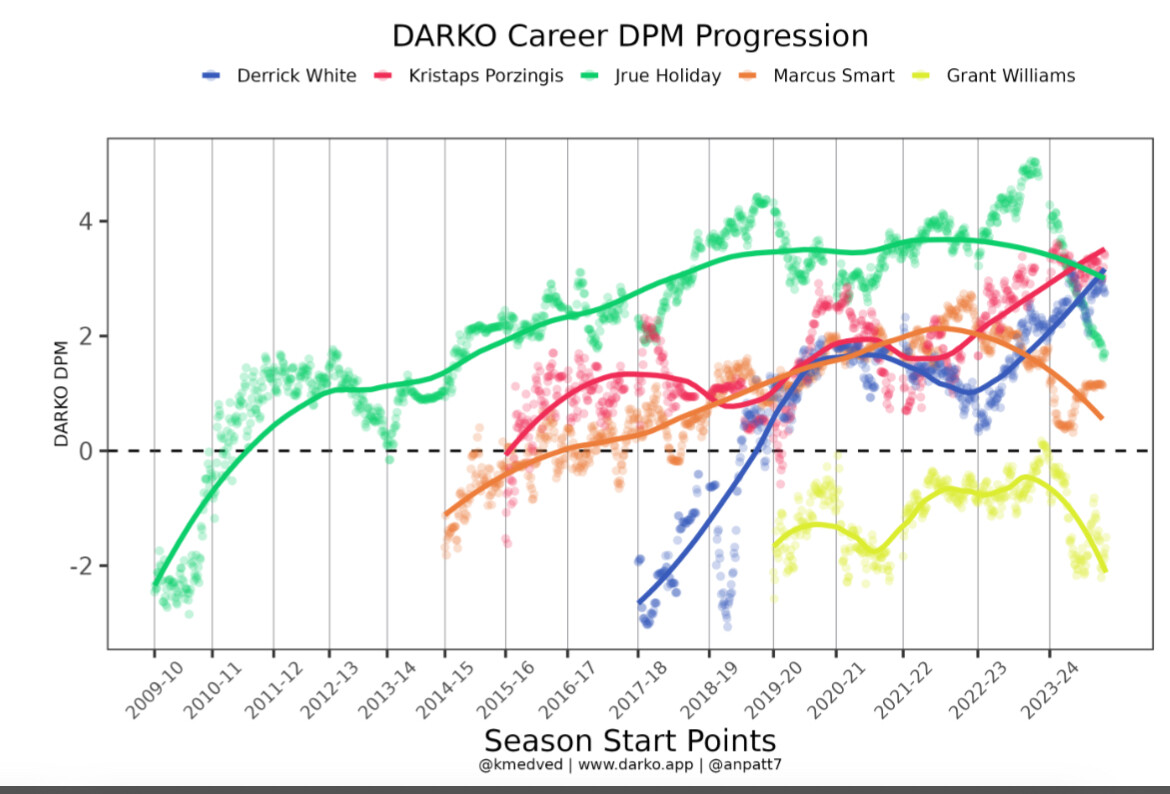 Yeah I don’t think it’s a mystery, just interesting. Though it does seem like his D impact per DARKO at least changed. I’m not sure how seriously to take that. DARKO’s box score D metric has never really loved him but the pure adjusted plus minus part seems to. And it’s the latter that changed this season. Ofc basketball-reference’s box score D metric liked him a lot better bc even tho his STL rate was the worst in his career, his BLK rate went to a career high.