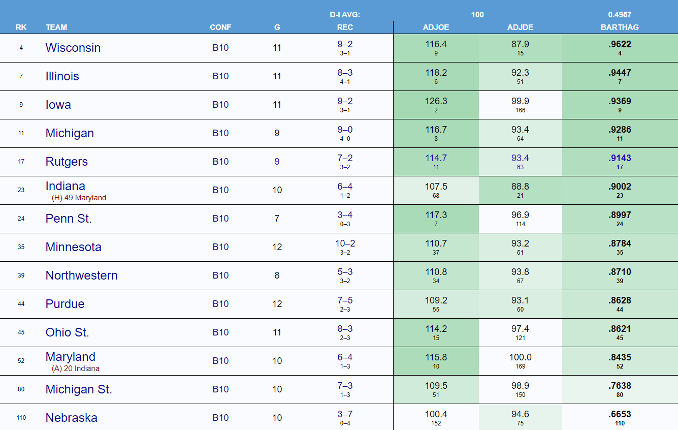 A lot of preseason talk had 4 teams fighting at the top of the conference, I think considering the double bye in the tournament. But right now I think tier 1 is five teams with Wisconsin, Illinois, Michigan, Iowa, and Rutgers. The tier 2 might be Indiana and Minnesota on their own, because I agree Ohio State is a tier below where a lot of people thought the were preseason. Also I don’t have faith in either of those coaches. Tier 3 with OSU, Northwestern, Purdue, Maryland, and maybe MSU is where the big 10 will fight for tournament teams. I don’t see Penn St making it this year, and Nebraska is a tier below that.