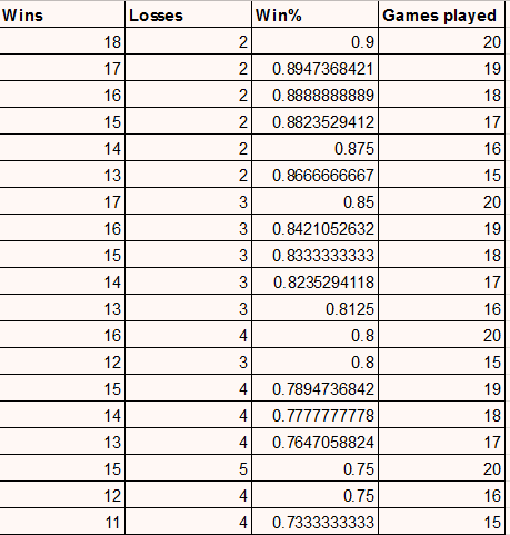 I just ran quick numbers to get a better picture of who would win the conference based on win% in the likely event of uneven games played. This might be intuitive for others, but basically it comes down to fewest number of losses. If two teams are tied in # of losses, then # of wins would obviously be the tiebreaker. Caveat being the 0.8 and 0.75 win% rows as they can be reached at 16 & 20 games played and 15 & 20 games played respectively.