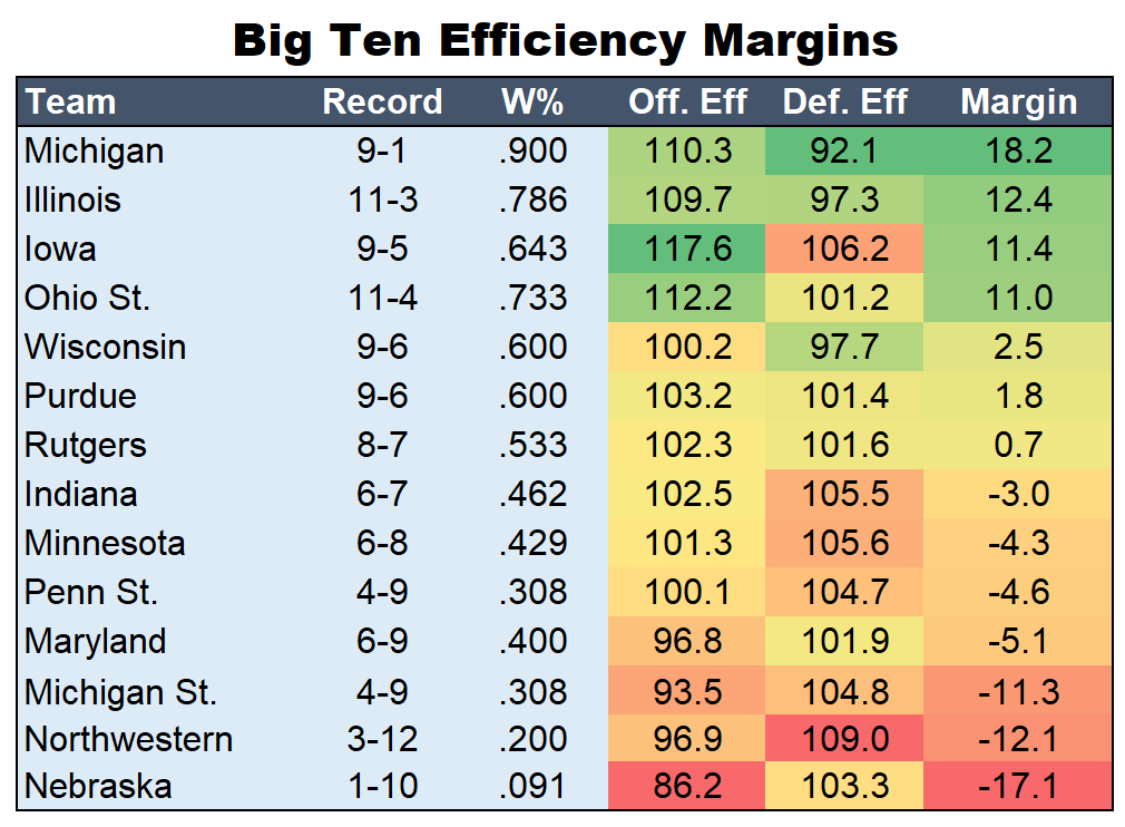 Four good-to-great teams and then a Grand Canyon-sized chasm before you get to Wisconsin and Purdue. Difference in EM between OSU and Wisconsin is greater than from Wisconsin to Maryland, the 11th place team in terms of EM.