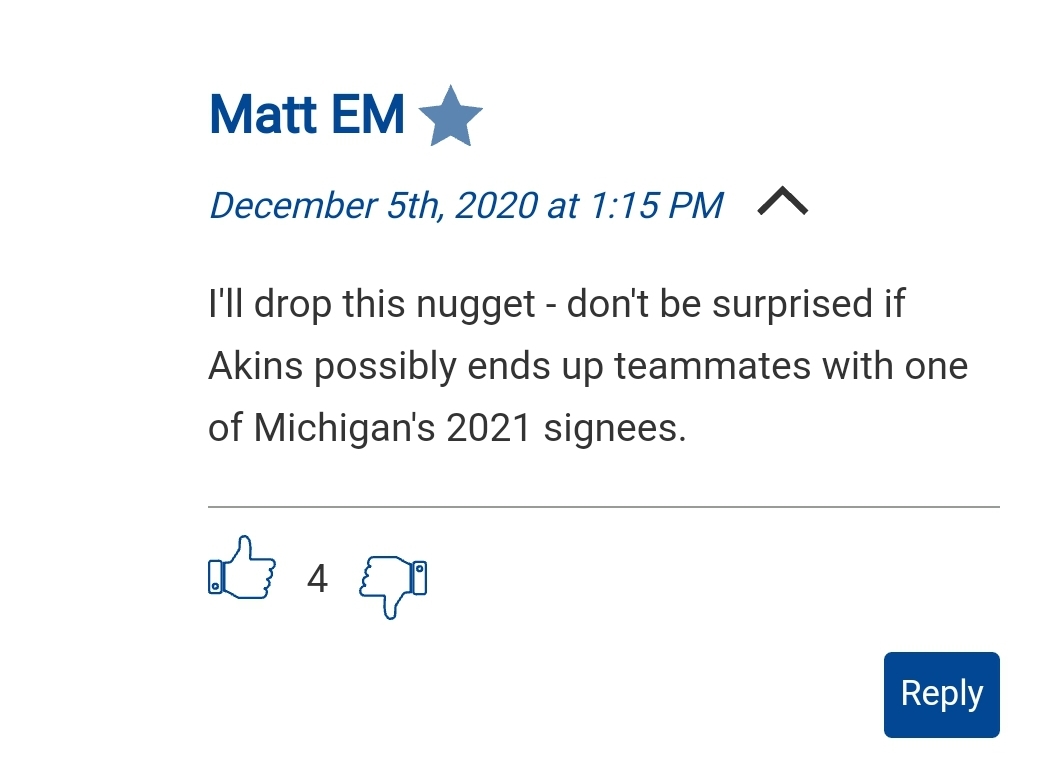 No idea. Just sharing what was posted on mgoblog, though you’d think if this came true (Akins playing with an M signee) that it certainly couldn’t hurt Michigan’s chances.