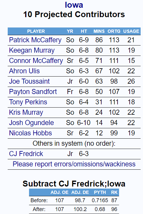 Tonight, in an all-new Bart Torvik RosterCast Theatre, we visit Iowa City and take a peek at what’s left for Fran & Co.:
