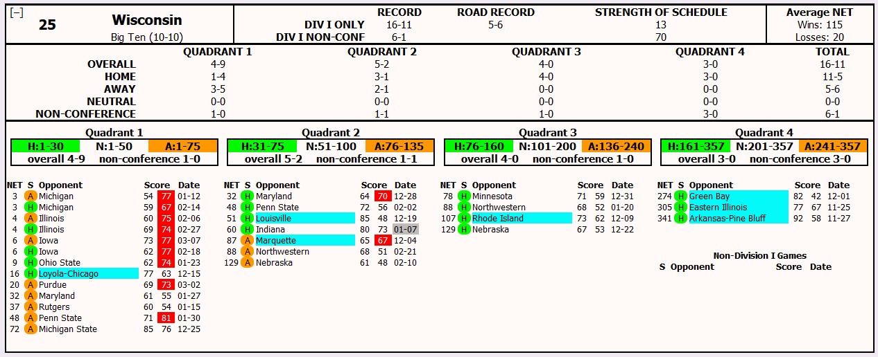 Wisconsin has a slightly better avg NET win and loss, a significantly better non-con SOS, and a better road record. Obviously all of those come with the caveat of this season is weird and those numbers are skewed/don’t mean as much as a normal year, but combined they make a difference.