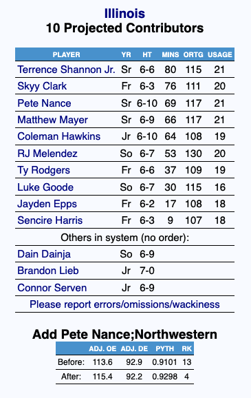 Illinois has lost six of its top-seven scorers and 84.5% of its scoring from last season and must replace 148 of 165 starts and 80.7% of its minutes from last season.