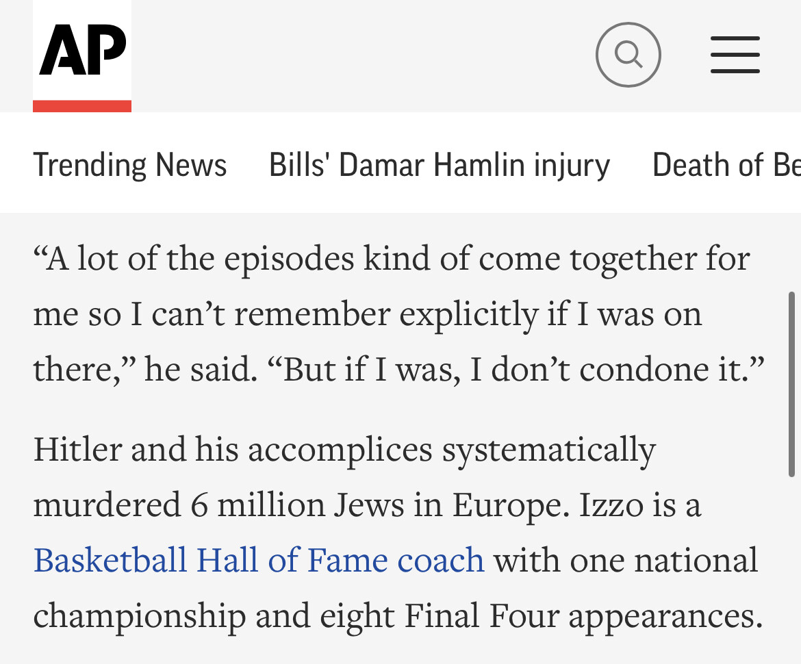 âHitler and his accomplices systematically murdered 6 million Jews in Europe. Izzo is a Basketball Hall of Fame coach with one national championship and eight Final Four appearances.â