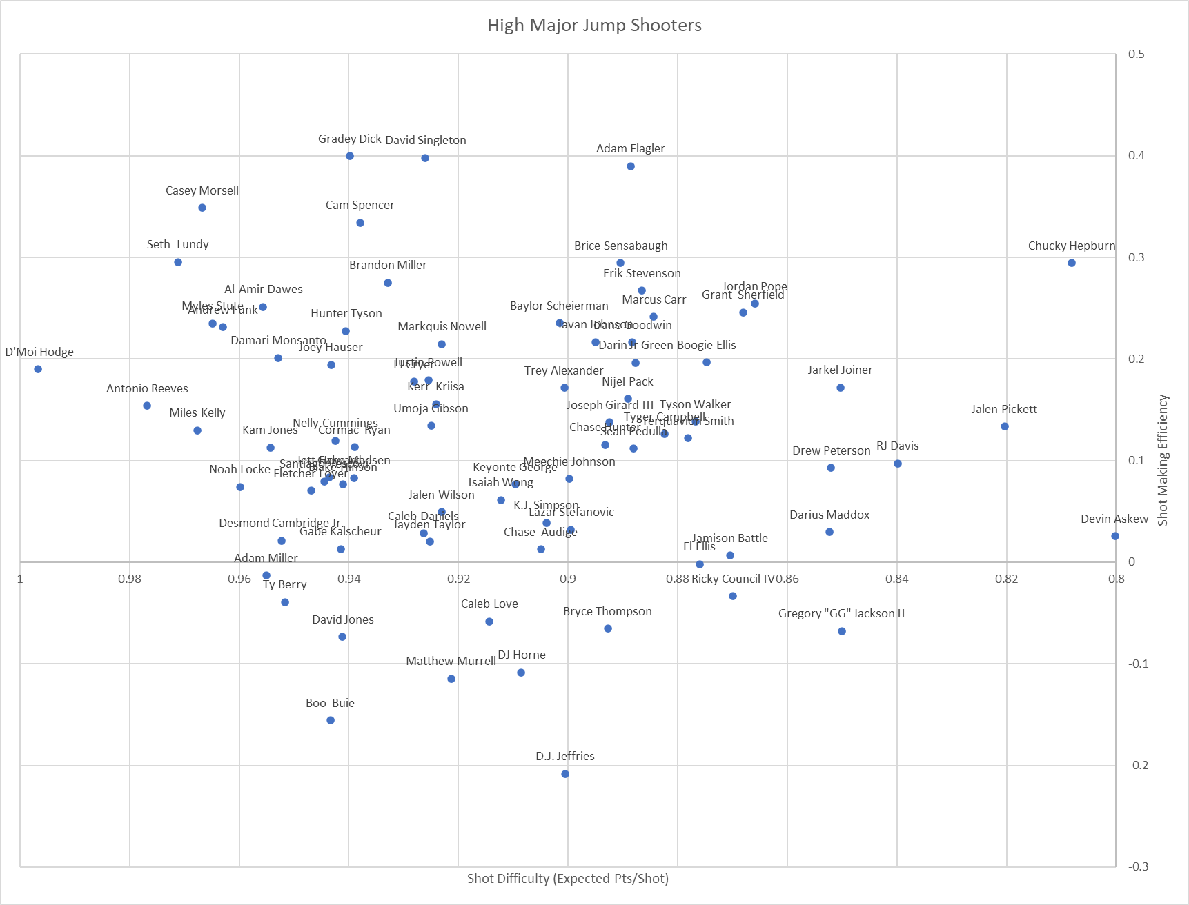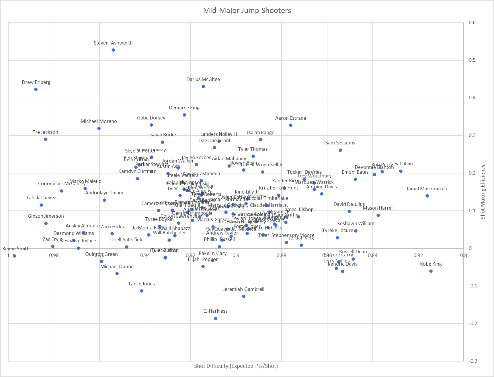 Here you go… mid-major jump shooters with over 125 jump shot attempts… Tougher shot selection to the right, more efficient shot making to the top.