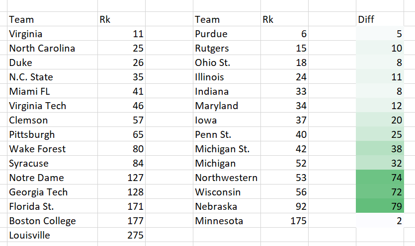 IMO Miami is probably 1, Duke/UNC/Virginia/Clemson all in the 2-5 range. Duke and UNC arenât playing well right now though but I like that top 5 over a conference that has a mediocre Michigan State team and Rutgers looking like top 3 squads.
