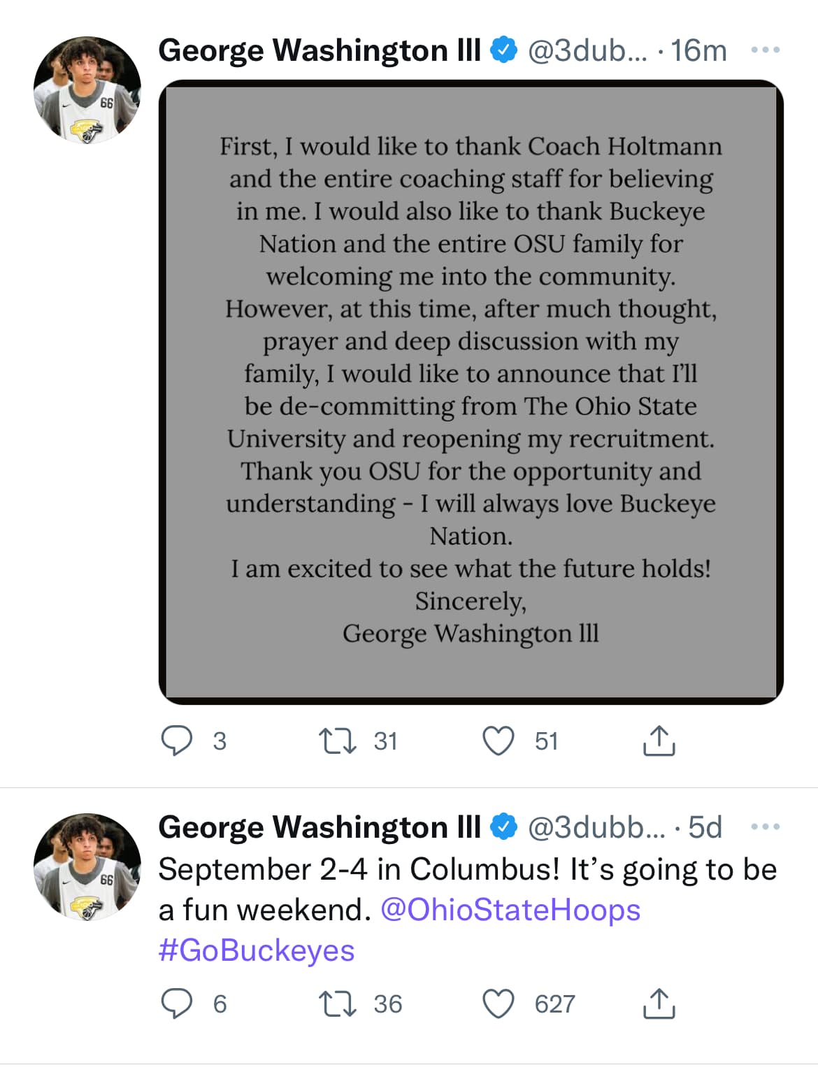 So a basketball player whose name is actually âGeorge Washingtonâ decommits from The Ohio State University and all we can come up with is Labron James and Son comments? People.