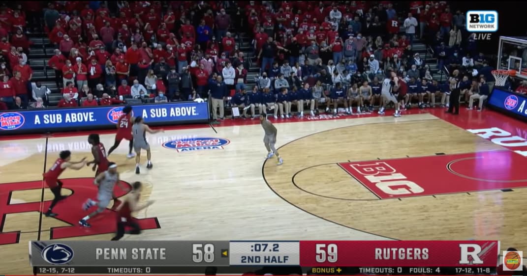 While Iâm on my salty fan soapbox Iâll just note that Rutgers was screwed in a similar way against Penn State last season when their defender jumped over the sideline guarding an inbound pass at the end of the game (upper right corner).The dude in the black shirt three rows behind Penn Stateâs bench is pointing it out while the ref four feet away misses it. In this case Mulcahy ended up turning it over but Penn State missed the shot. But this is twice in a 12 game span that refs have choked in the final seconds on a clear sideline violation to the detriment of Rutgers.