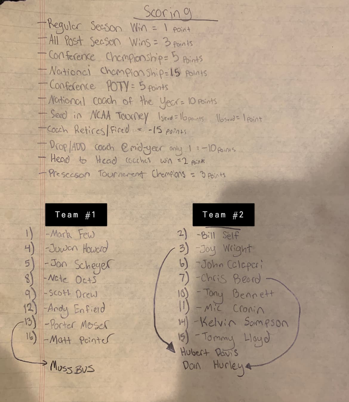 To all my college basketball lovers in this forum, I have the ultimate fun fantasy style game my Dad and I created. The college basketball coaches draft. We started this and did our draft right after the 2021 season before last year’s season for reference so right after Michigan was a one seed. Here’s our game sheet for you guys to look at. So far we’ve been editing and improving it on the fly, but it makes college basketball so much more fun and gives you many more teams and coaches to root for! So here it is below and I’ll gladly take any and all comments, criticism, and suggestions. Also, would 100% recommend you guys playing too! I’m team #2 and lead by a pretty wide margin entering this year, but due to Jay Wright and Chris Beard have lost a bunch of points