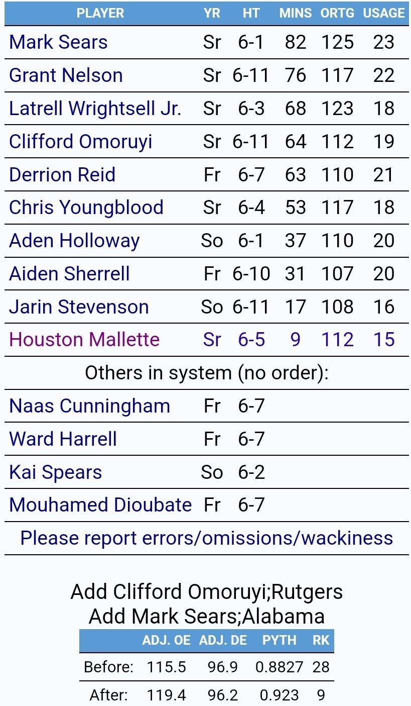 If Sears isn’t back I think Alabama is just a normal good team. Not sure a Youngblood/Nelson/Wrightsell/Omoruyi core is gonna be a top 10 team