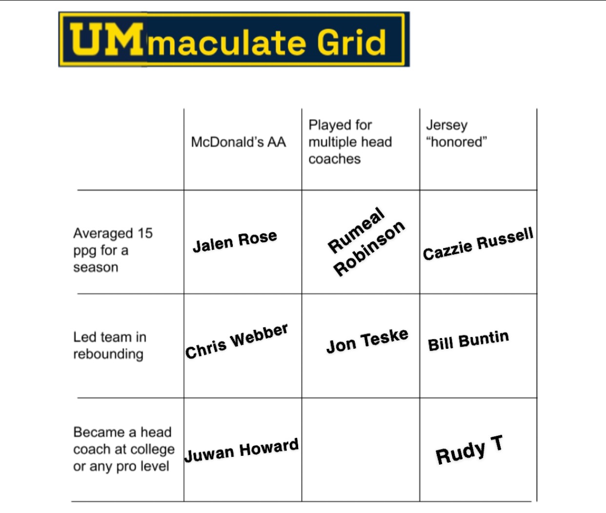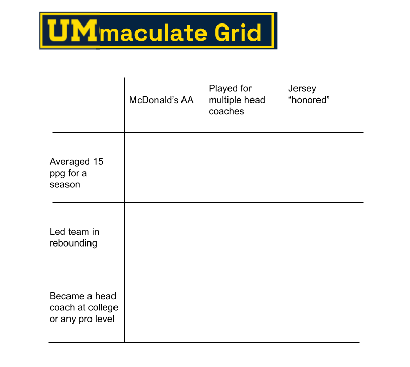 Anyway, in trying to give us something silly to do on Friday afternoon, I’ve made a low-tech one for Michigan Basketball players (so only guess Michigan players or else it’d be too easy). Since I’m not hi-tech enough to make this an actual program, I recommend you fill this out (or just type up your answers), save it, and then check your answers. You can mark which ones you got wrong in your post. Honor system.