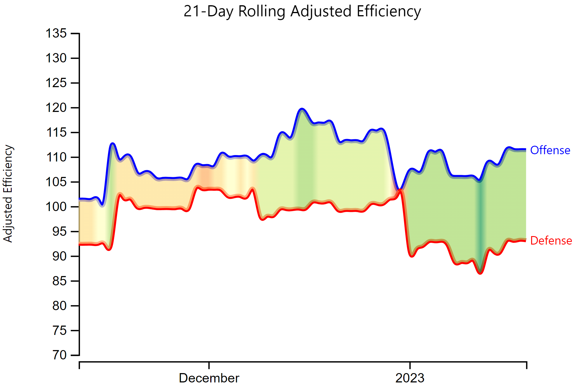 Can you explain the big changes around the turn of the year? Unless your 21 day average has some recency bias built in, I would assume those changes reflect games that games roll out of the 21 day average at about that time, so about Dec 10. That period was apparently the nadir of efficiency, but I don’t see anything in the Kentucky, Minnesota and Lipscomb games that really jumps out. I guess the other possibility is that the earlier UMD game is driving changes, but that’s a big impact for one game!