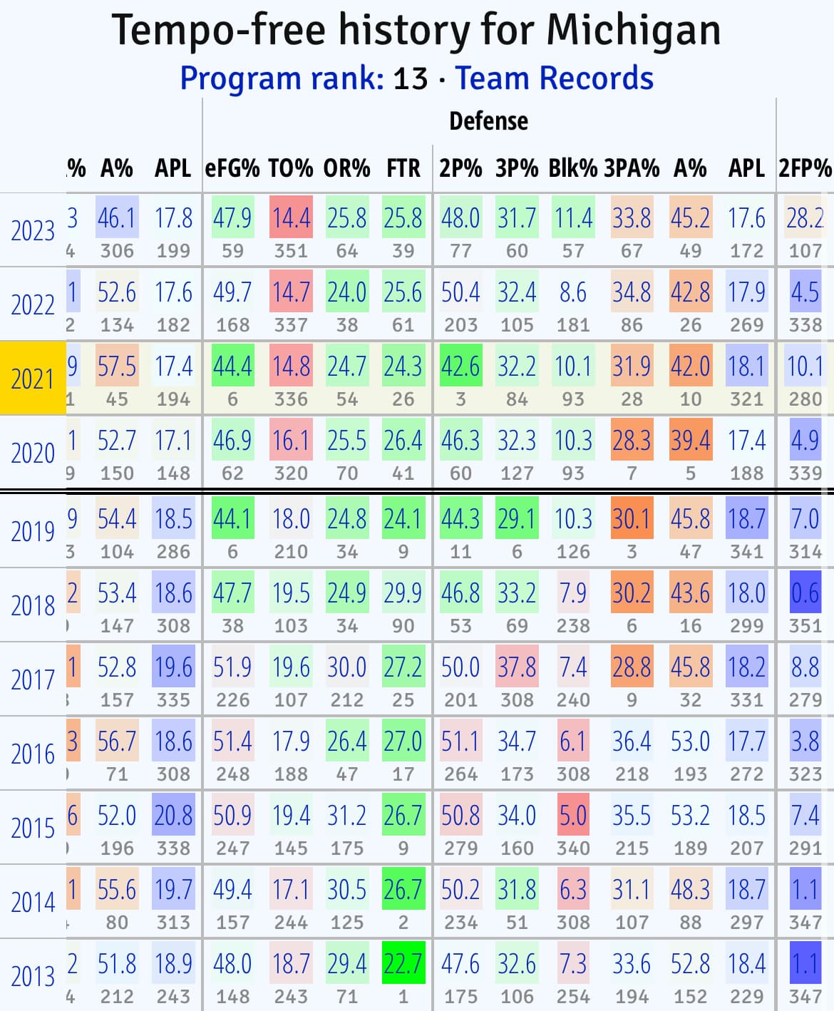 I agree with that. I think having an elite perimeter defender with length and switchability is the key to an elite defense more so than a rim protecting center. Donât get me wrong, having someone more athletic than Hunter to protect the rim is valuable, but if youâre relying on them to clean up all of the perimeter messes I think your ceiling is limited. Having Franz Wagner or Charles Matthews is really what elevates your defense. Those two guys are also a big part of all the fancy numbers in the table since those are two of the best defenders Iâve ever seen watching Michigan basketball the last 30 years.
