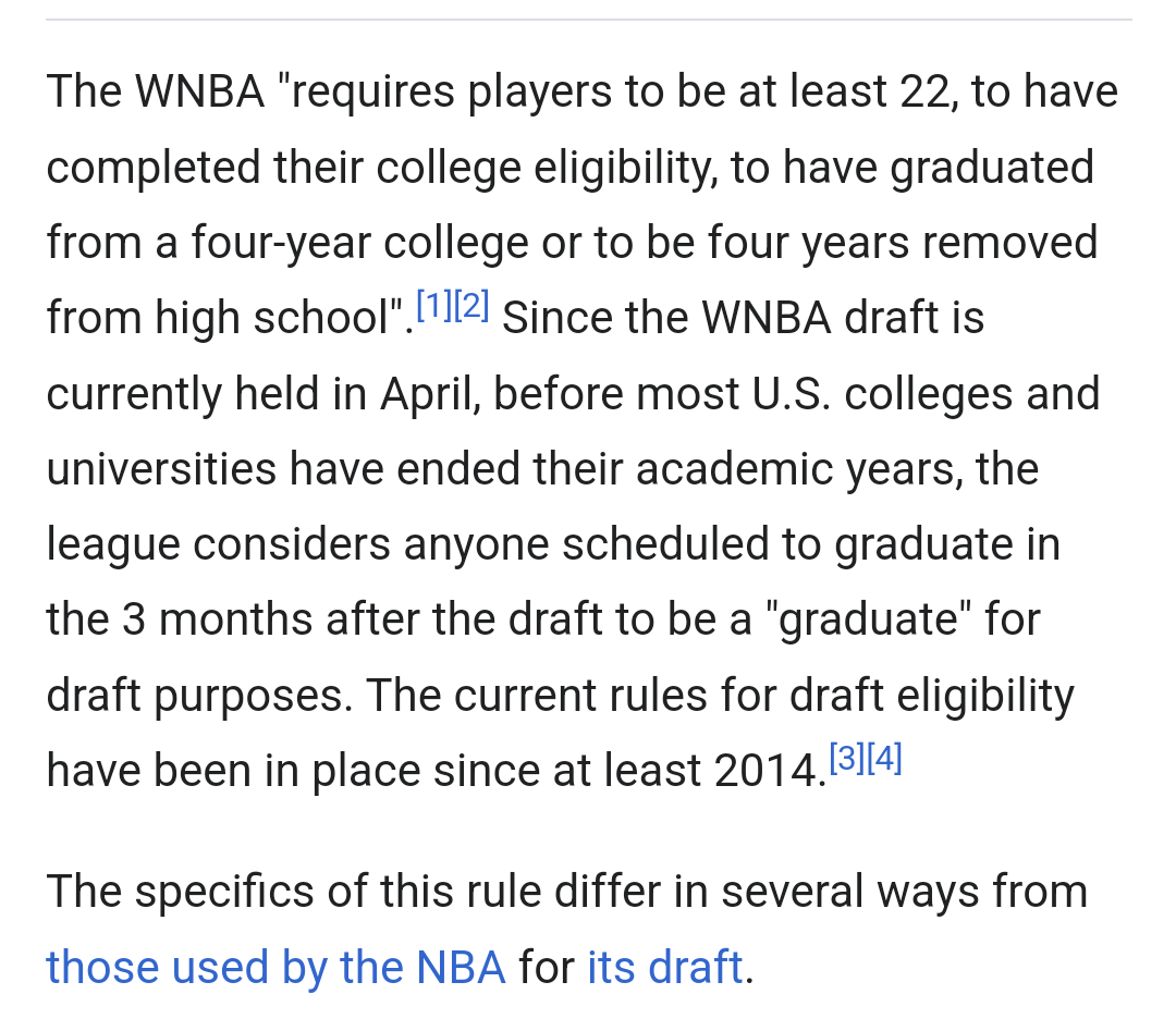 Sorry…don’t drink and forum post. I was thinking under classmen. I think the reality, sadly, is that the WNBA doesn’t pay very well so it isn’t as impactful especially with NIL as the other sports. But all of the sports restrict draft eligibility in some way so it isn’t that extreme and I think there are some foreign leagues that would be options other than college maybe.