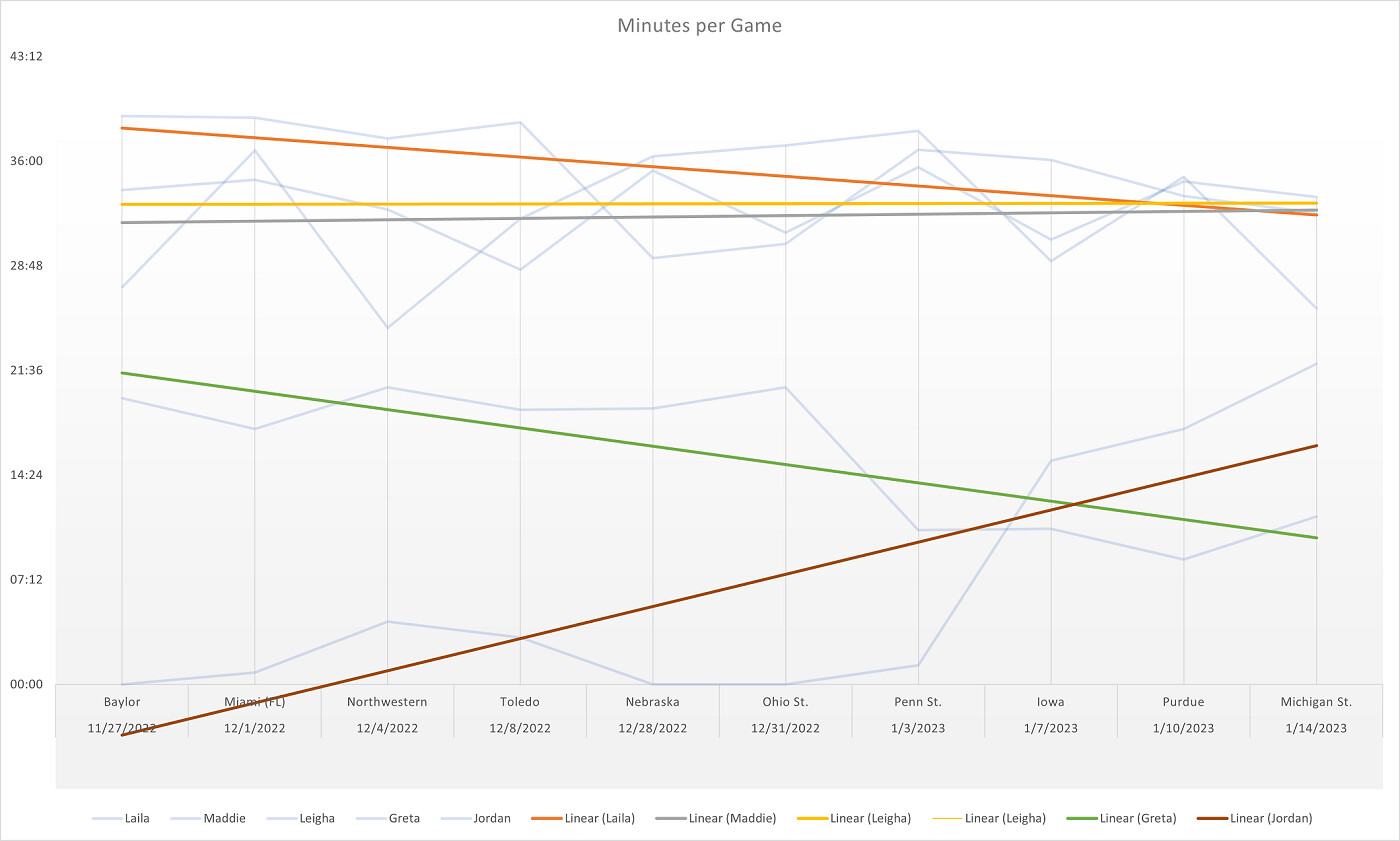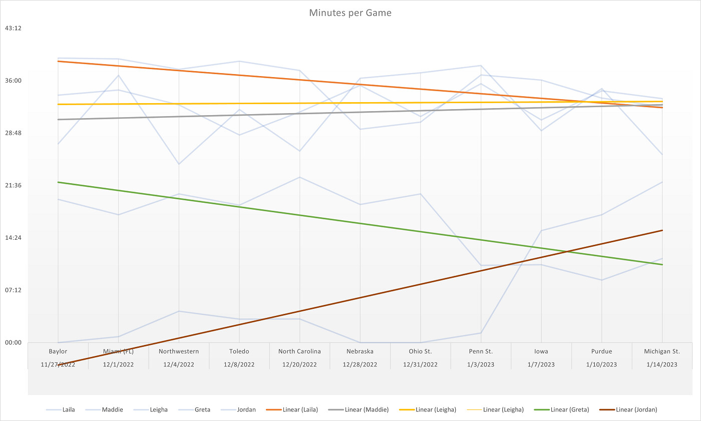 You can see that the top of the rotation has been very consistent with all of them converging right around 33ish minutes currently. Interestingly enough, it’s Laila’s minutes that have dropped off the most from the top 3. You can definitely see the trend of Greta’s minutes going to Jordan Hobbs lately, especially starting with the Penn State game. That will be interesting development to watch going forward as I have been under the assumption that Greta would be the starting 1 next year.