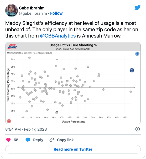 Siegrist is obviously awesome, but Gabe is being a little funny by limiting it to the Big East. Caitlin Clark is at 61% true shooting (Siegrist 60%) on 37% usage (Siegrist 38%). So…pretty similar!