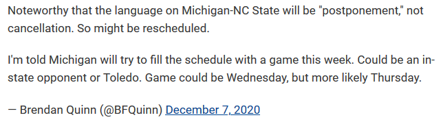 Seems like the best way to still play NC State is to play Sunday instead of Penn St if possible, Penn St also doesn’t have another game until 12/23. More likely, it seems this game is cancelled and Michigan fills in something else.