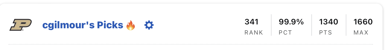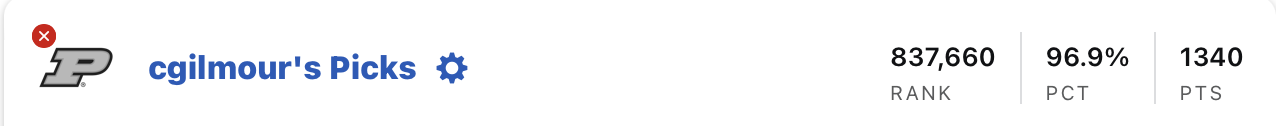 Thought I was headed for a last place finish the opening week, but now I’m a couple of Purdue wins away from pulling this down!